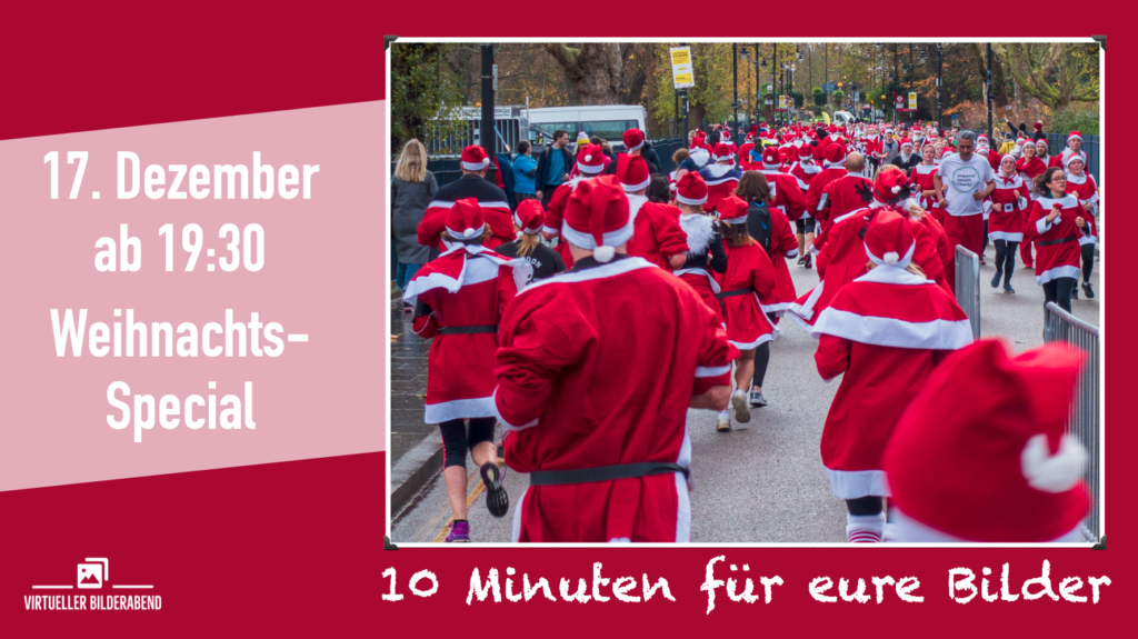 Für den Dezember haben wir uns für euch wieder etwas ganz Besonderes ausgedacht. Abweichend vom normalen Rhythmus werden wir den Bilderabend am Mittwoch, den 17.12. durchführen und eine kleine virtuelle Weihnachtsfeier gemeinsam mit euch veranstalten. Dieses ist dann auch der zweite Geburtstag unseres virtuellen Bilderabends.